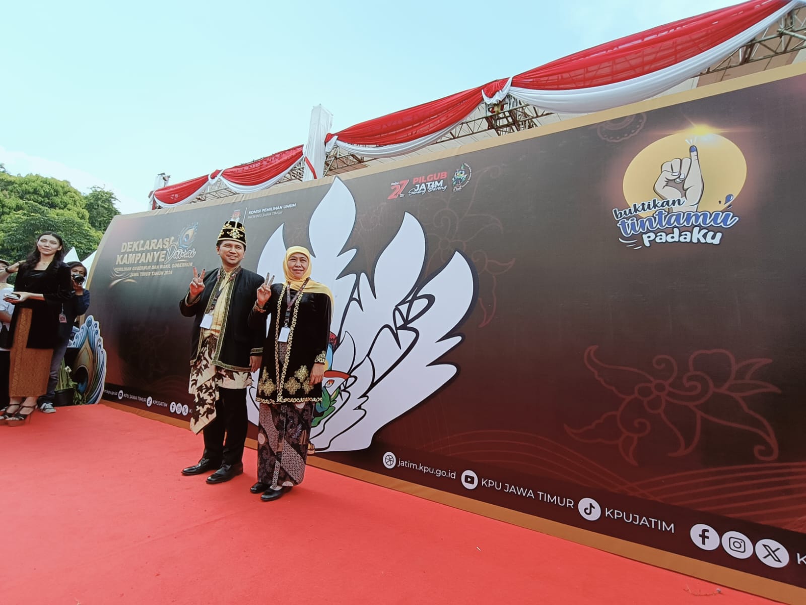 Tepat pukul 14.15 wib, cuaca berubah kembali menjadi cerah. Seiring kondisi tersebut, ketiga pasangan calon tiba di lokasi “Kampanye Damai”. Paslon Luluk-Lukman datang terlebih dahulu dengan mengenakan pakaian adat Madura. Kemudian, Paslon Khofifah Emil mengenakan pakaian adat Jawa. Sedangkan Paslon Risma-Gus Han juga mengenakan pakaian adat Jawa Timuran.